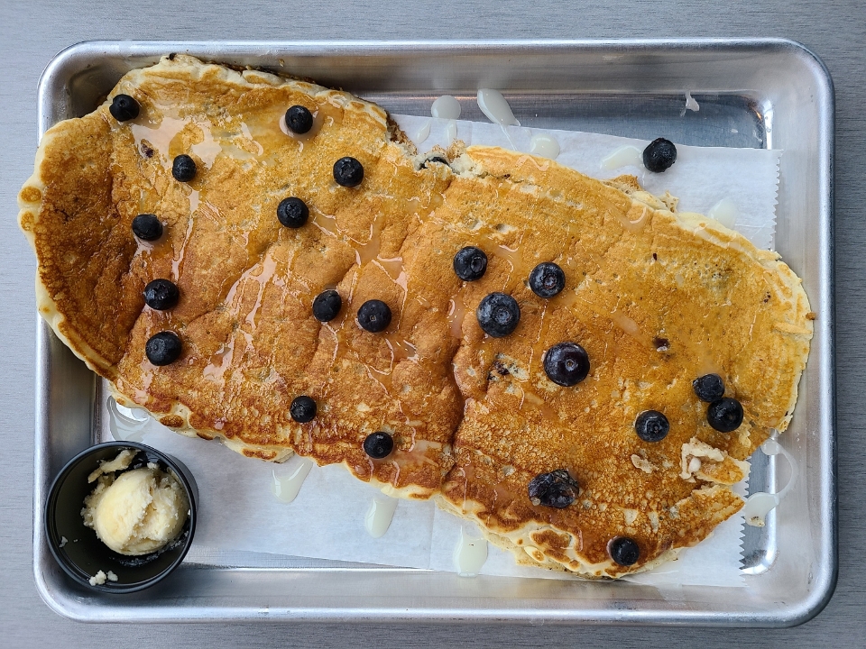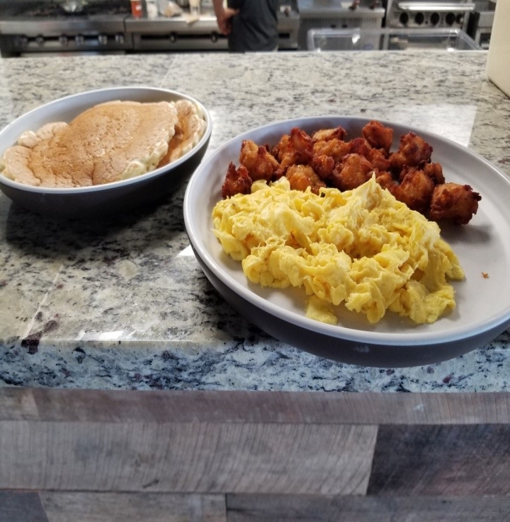 eggs your way served with breakfast potatoes & biscuit or pancakes add a side +4.50