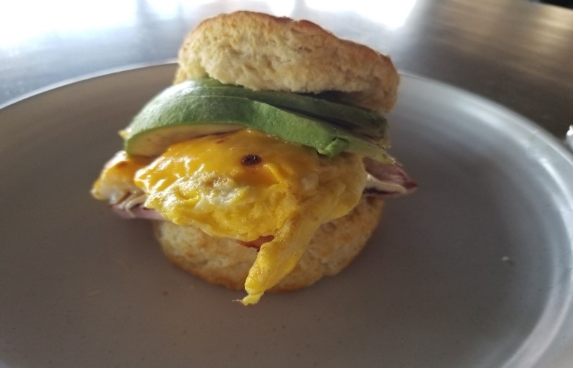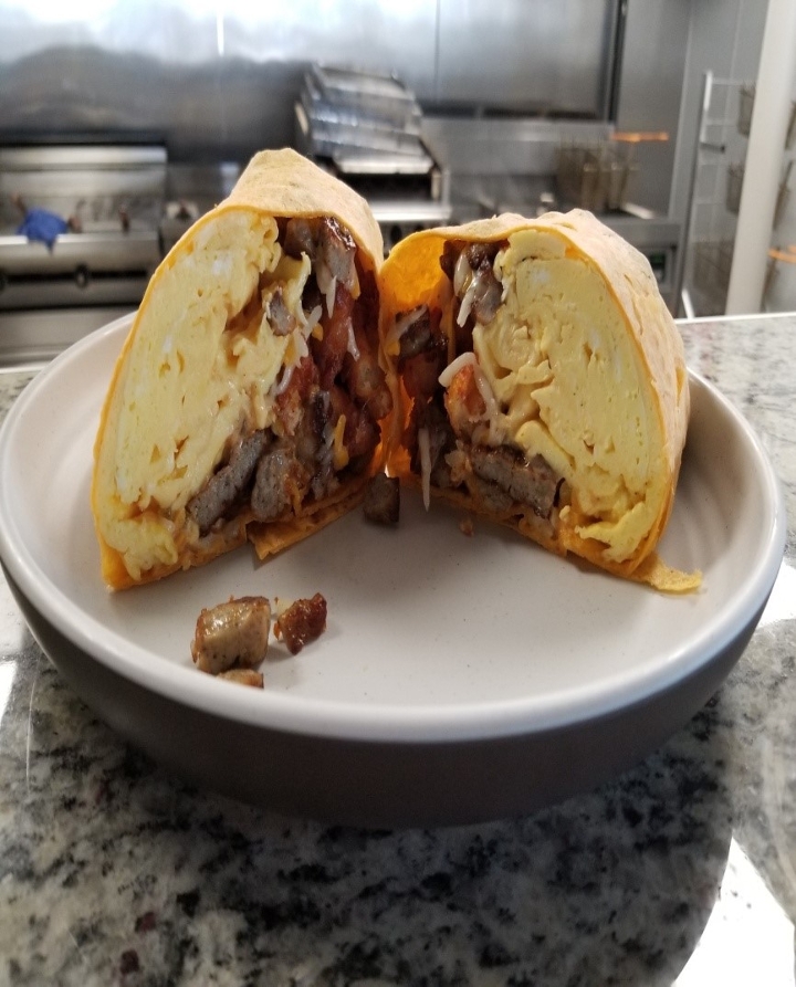 scrambled eggs, jack-cheddar cheese, avocado, jones sausage, breakfast potatoes & sriracha mayo