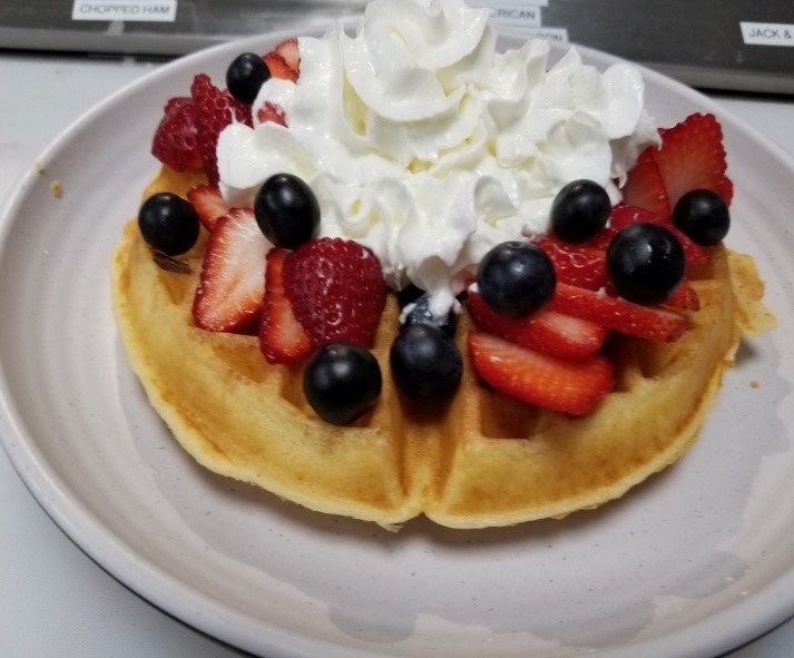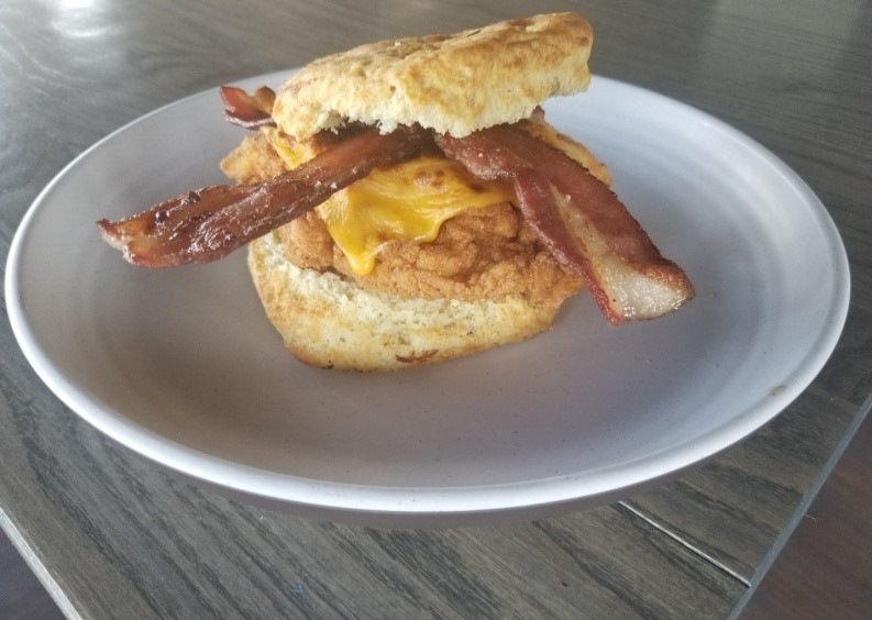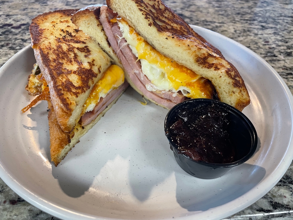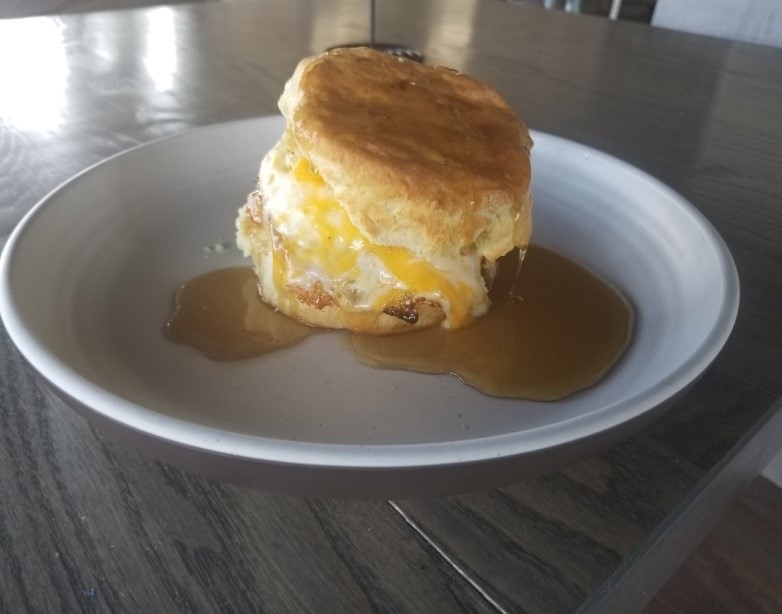 (jones sausage patty, ham or chicken sausage), homemade honey butter, fried egg, bacon, cheddar & jack cheese, covered in maple syrup