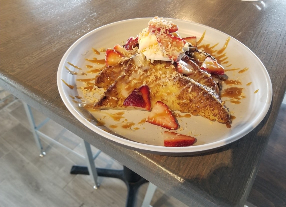 scrambled eggs, avocado, tomato, spinach, caramelized onions, jack cheese & sriracha mayo