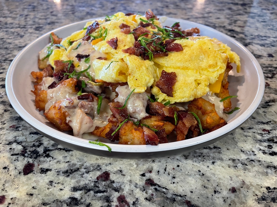 buttermilk biscuit, sausage gravy, chopped bacon, breakfast potatoes, melted american cheese & eggs your way
